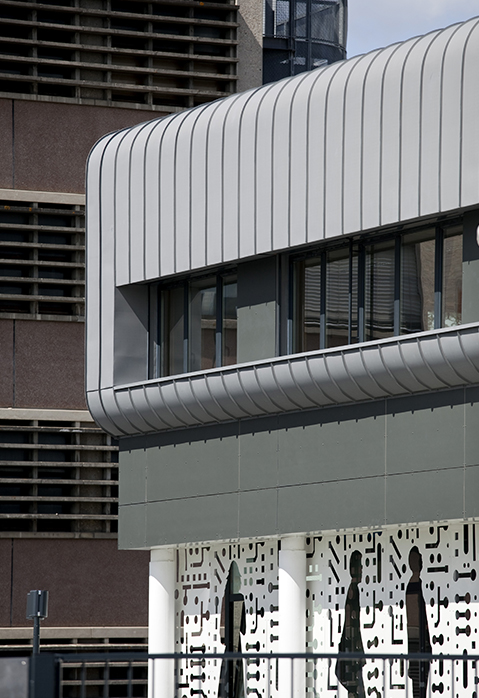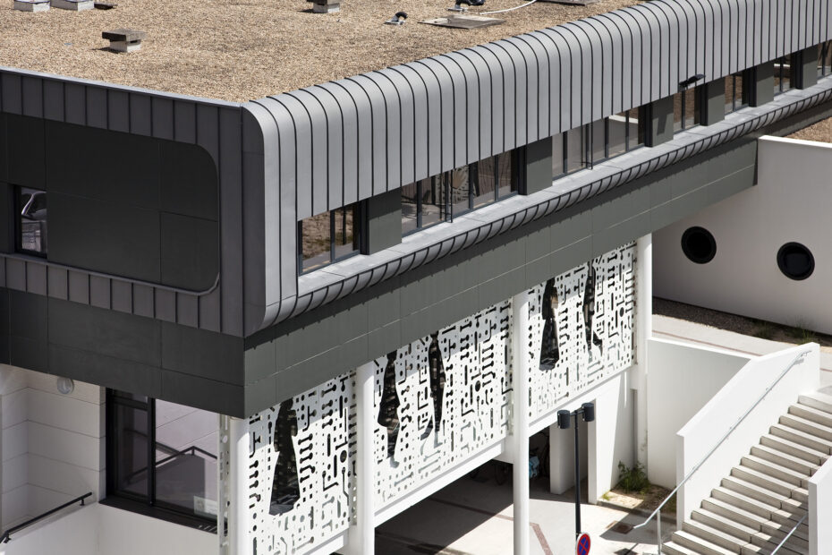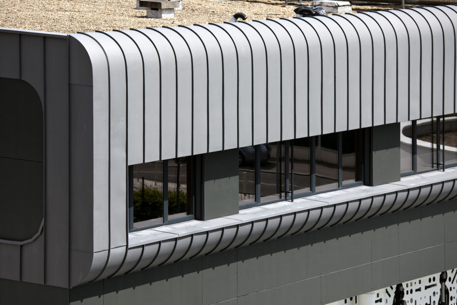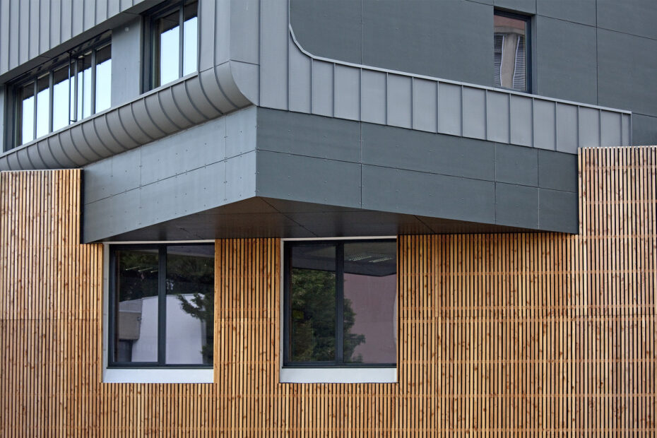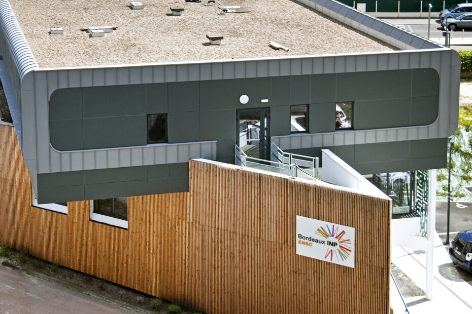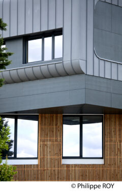 L’utilisation de zinc quartz en bardage à joint debout, et de plaques de fibrociment noires Hardie Panel, ont permis de redonner une seconde vie à cet ancien bâtiment qui abritait auparavant la faculté d’œnologie de Bordeaux II.